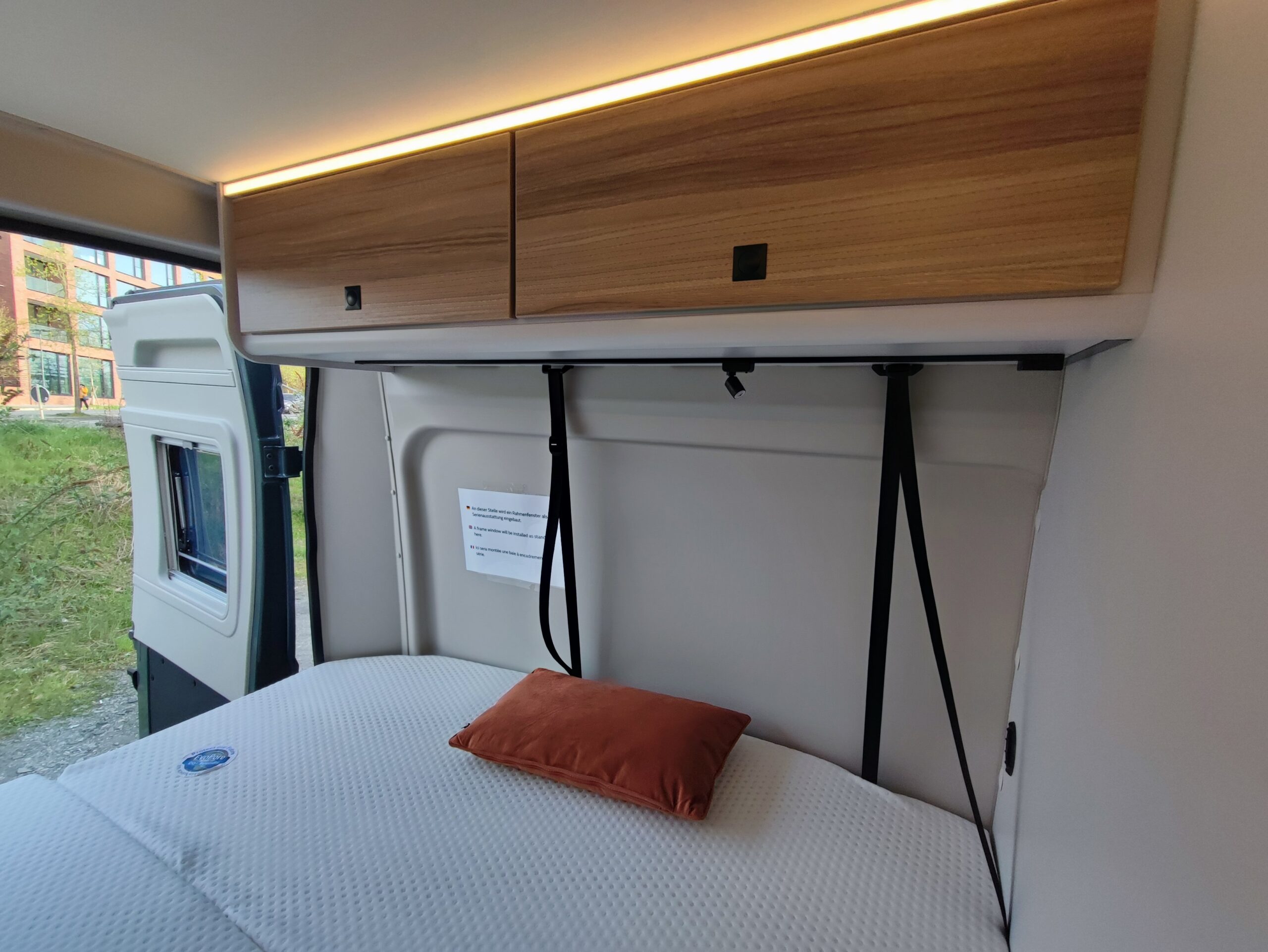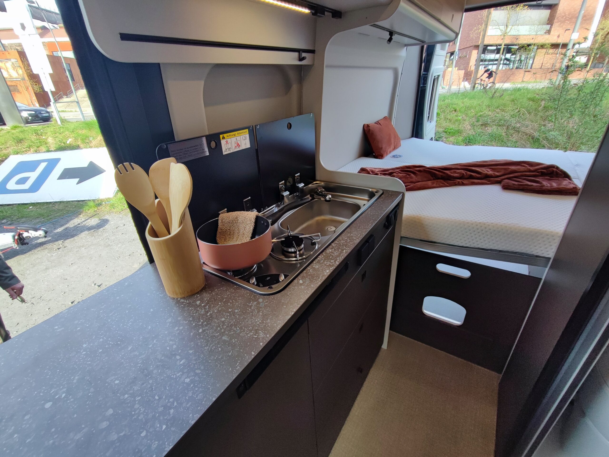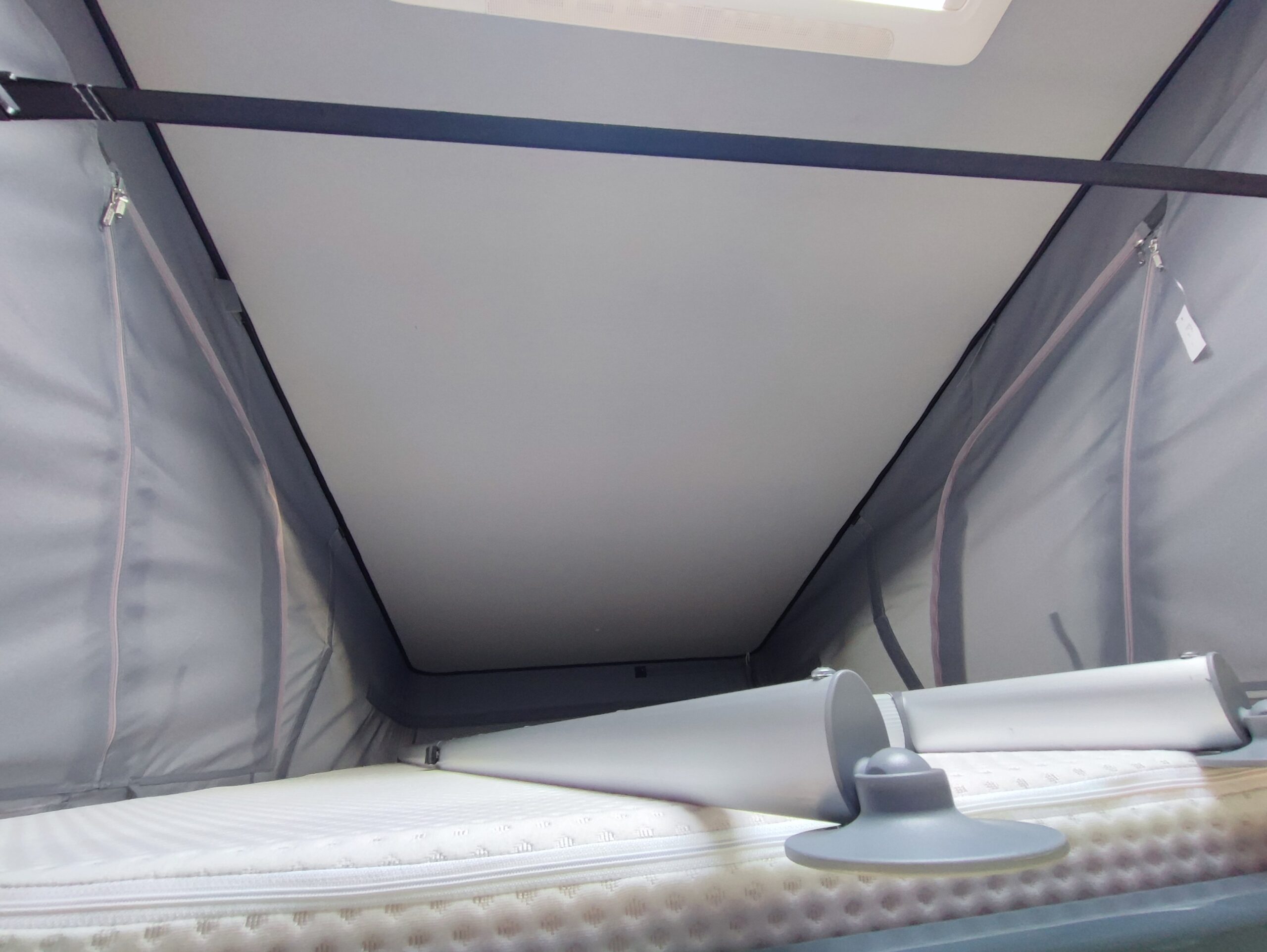 Mobilio interno in finitura casa pino, completo di blocco cucina e fornello a 2 fuochi, serbatoio acqua potabile con pompa a immersione, sedili anteriori con piastre girevoli, centralina di controllo CPU con caricabatterie e fusibiliera integrata, illuminazione interna ambiente a led, soffietto in tinta nera con nuovo sistema di apertura frontale completa, predisposizione per impianto litio, predisposizione per gancio traino, vetri posteriori oscurati, prese 12V e usb, tavolo ripiegabile, Gradino d’ingresso apribile elettricamente