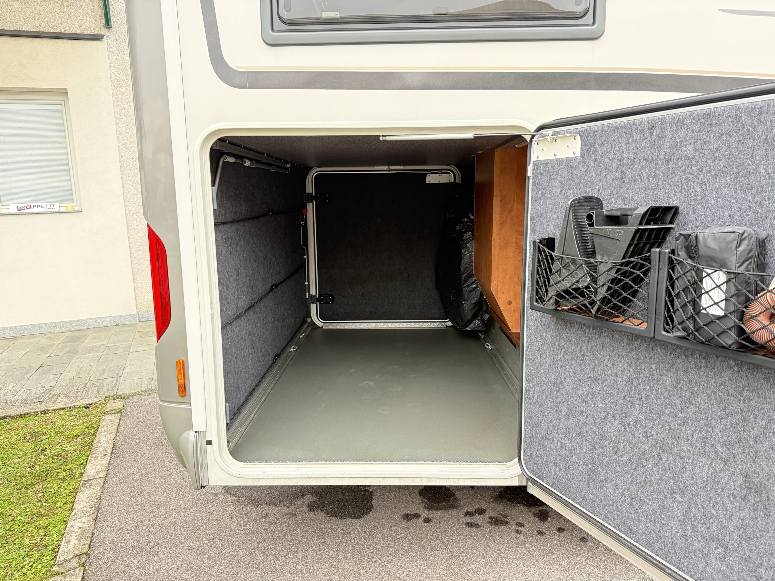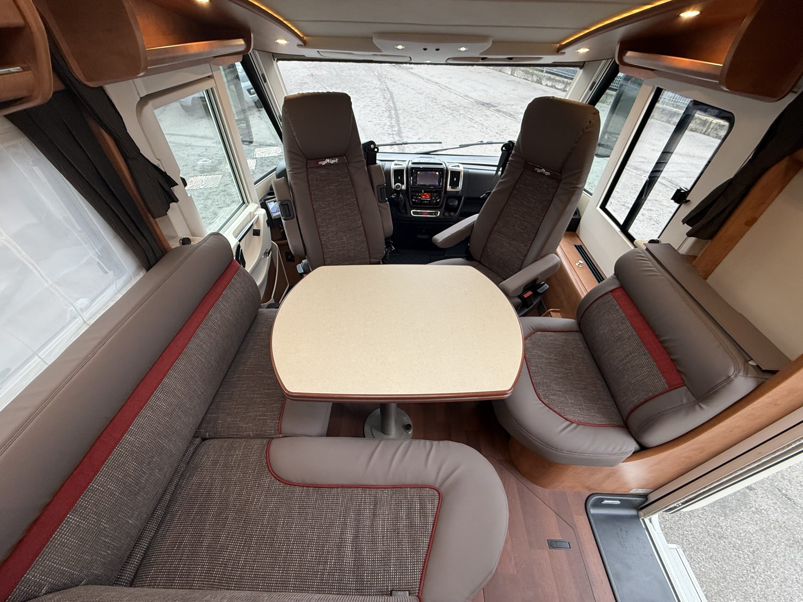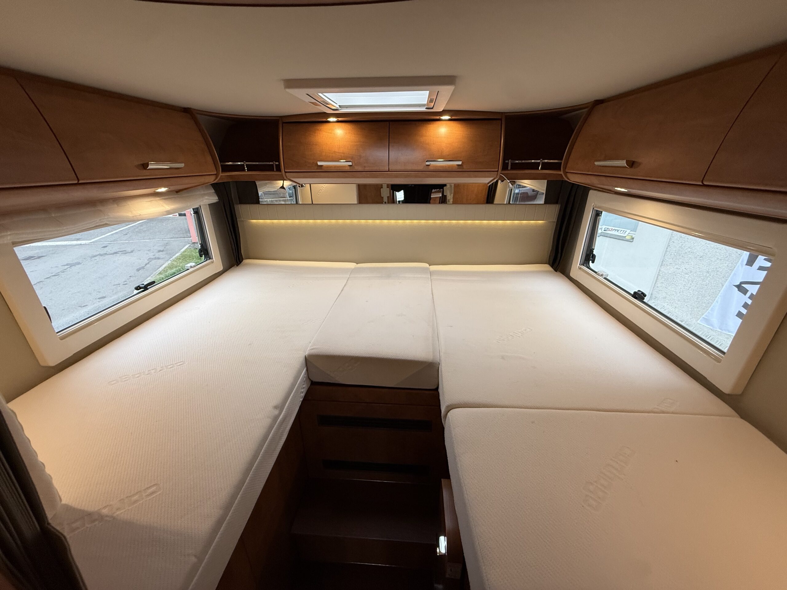 Ampia porta garage lato guidatore – Doppio pavimento passante – Upgrade garage con rivestimento pareti interne in feltro agugliato – Maxi oblò Heki in dinette – Vetrinetta bar con set bicchieri zona cucina – Comando CP Plus x Truma Combi – Frigorifero grande a commutazione automatica – Porta cellula a 2 punti con finestra e chiusura centralizzata – Sali scendi per macchina caffè in cucina – Attacco esterno acqua calda/fredda – Zanzariera scorrevole porta cellula – Luce esterna – Oblò letto basculante – Triogas – Prolunga + cuscini per grande matrimoniale posteriore – Sistema Sog per cassetta WC – Stacca batterie servizi – Tappezzeria in similpelle e tessuto