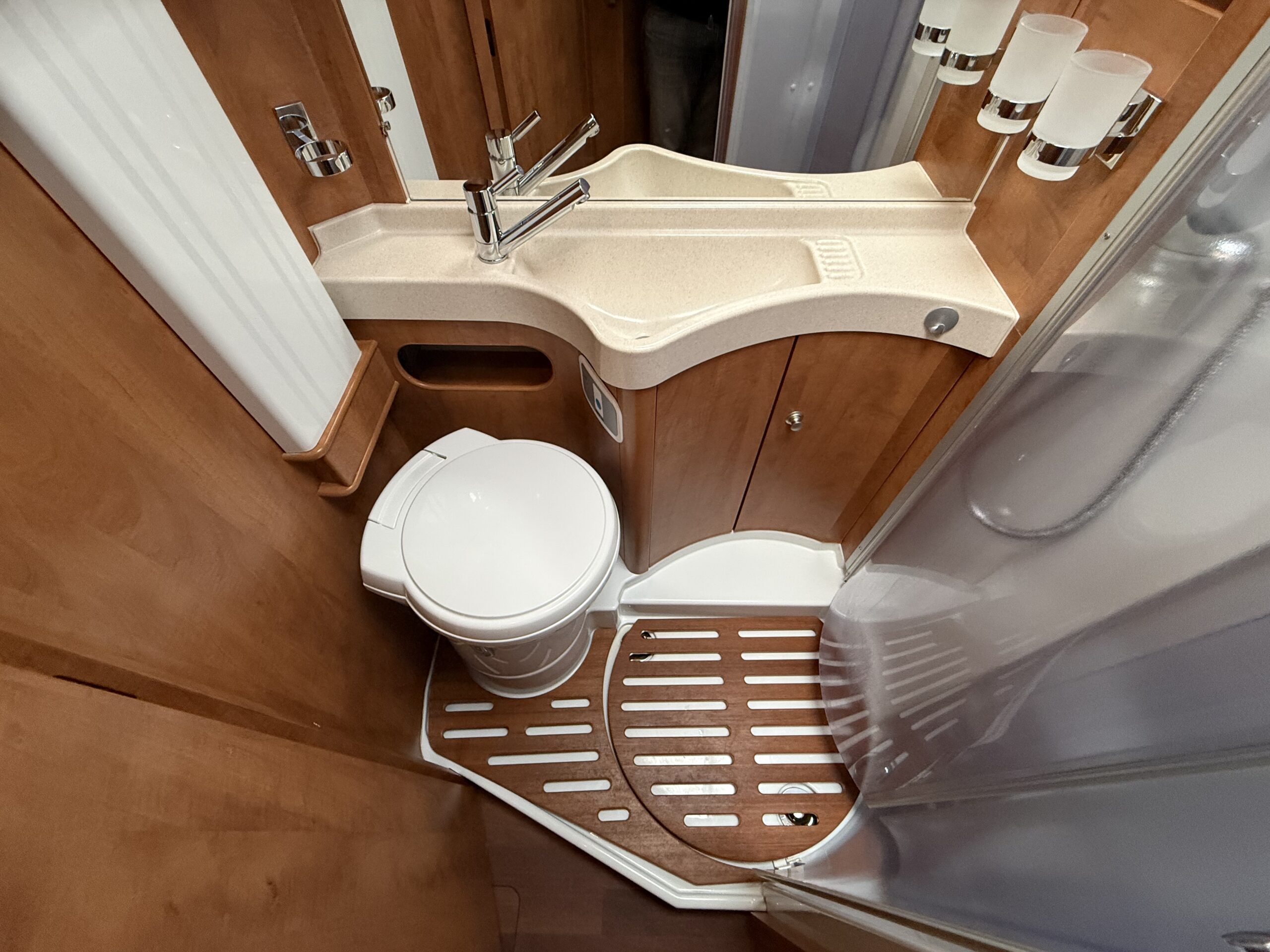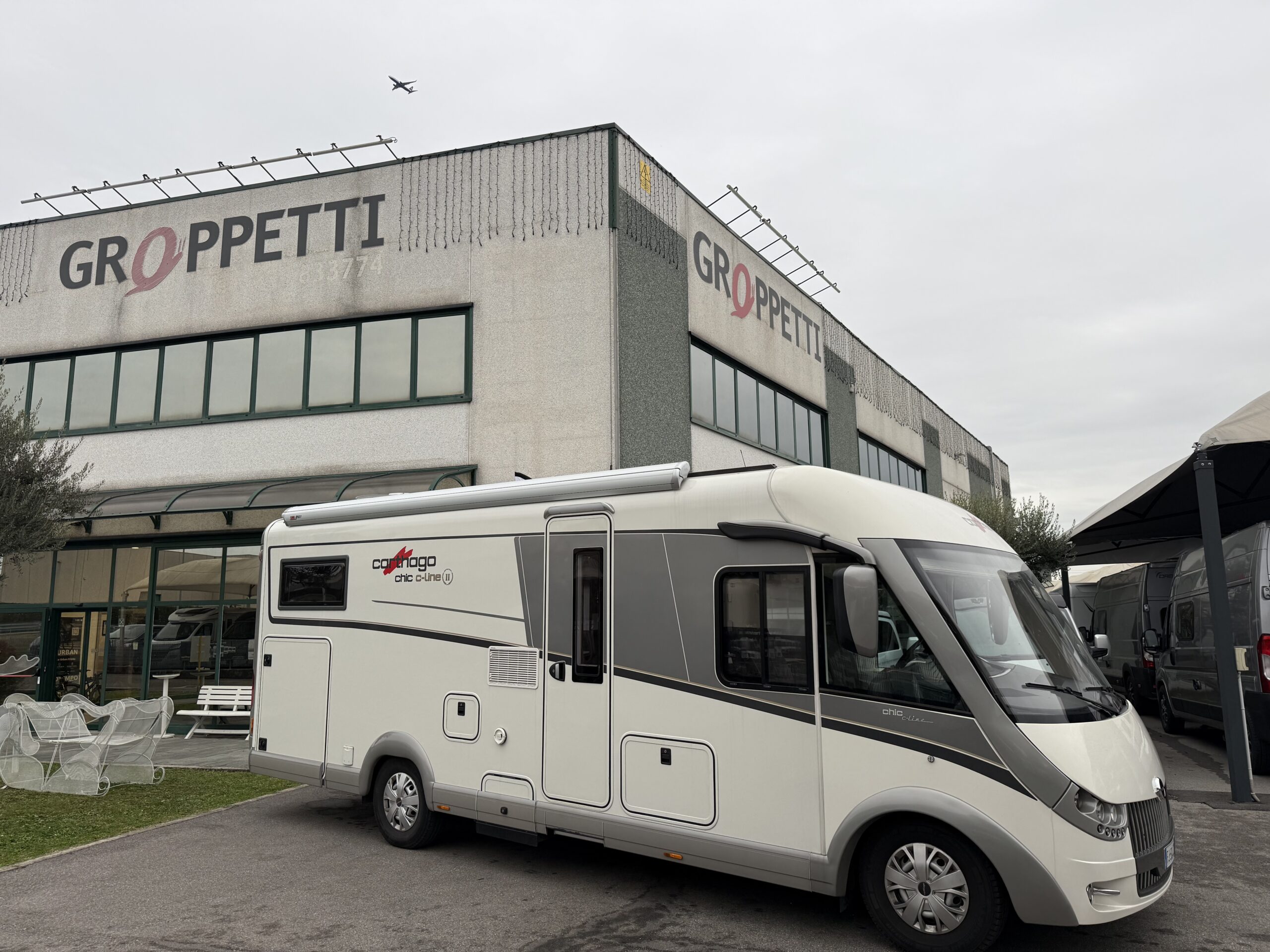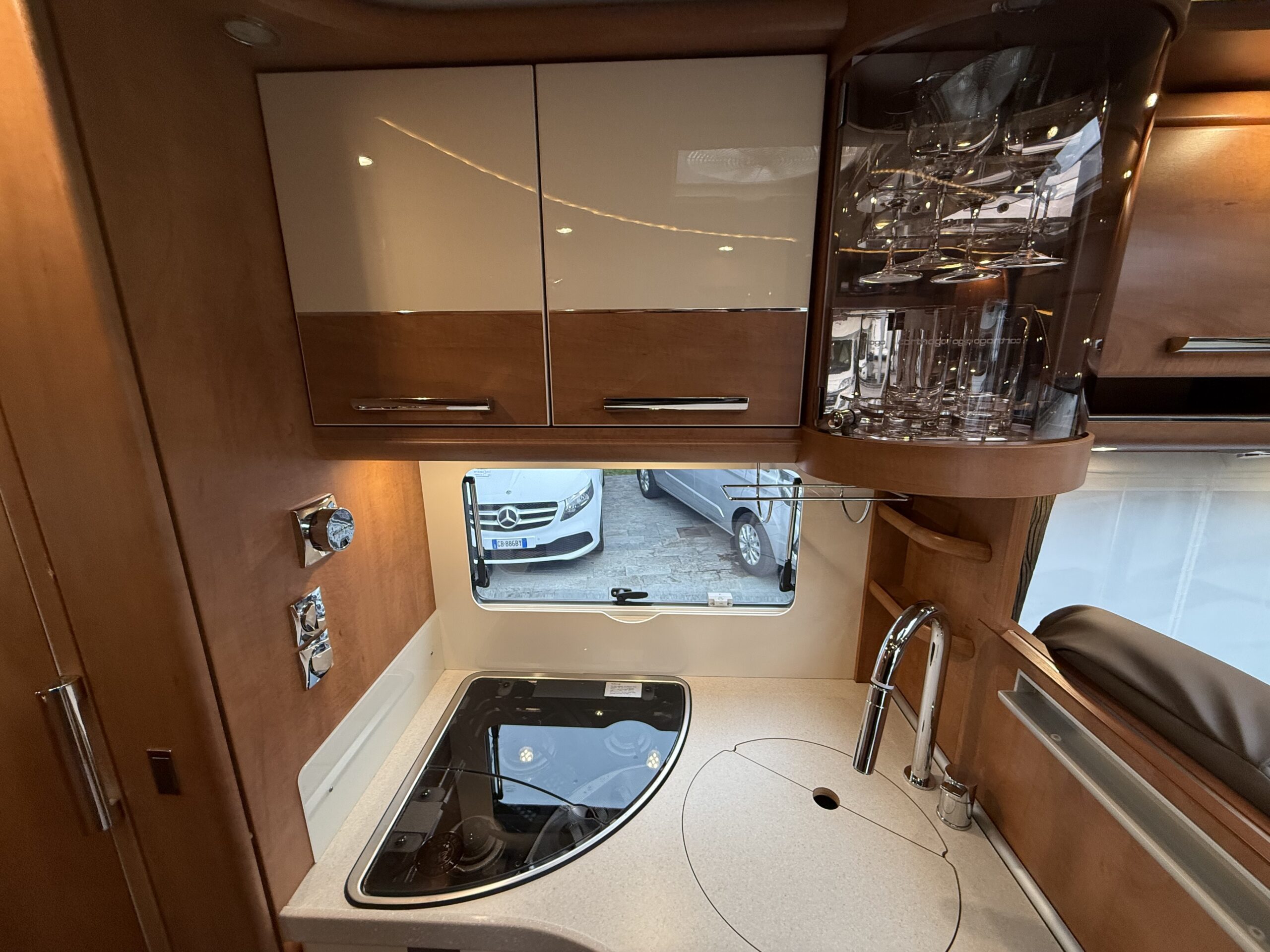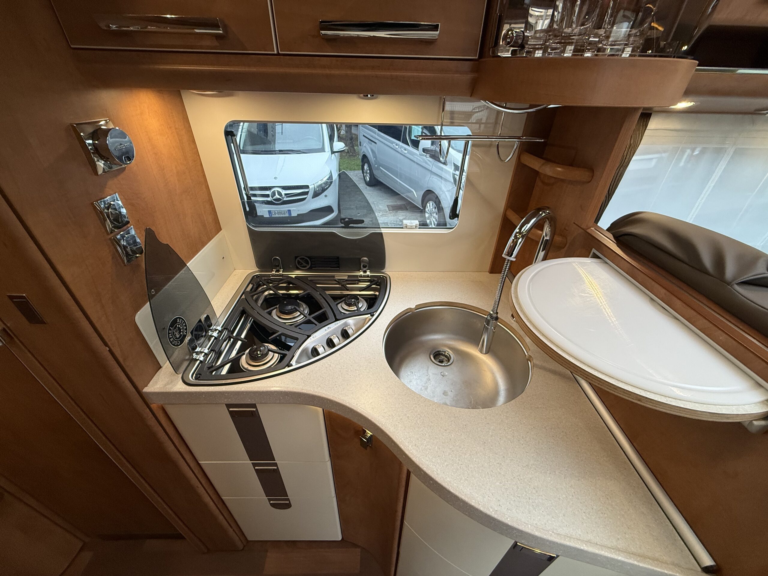 Ampia porta garage lato guidatore – Doppio pavimento passante – Upgrade garage con rivestimento pareti interne in feltro agugliato – Maxi oblò Heki in dinette – Vetrinetta bar con set bicchieri zona cucina – Comando CP Plus x Truma Combi – Frigorifero grande a commutazione automatica – Porta cellula a 2 punti con finestra e chiusura centralizzata – Sali scendi per macchina caffè in cucina – Attacco esterno acqua calda/fredda – Zanzariera scorrevole porta cellula – Luce esterna – Oblò letto basculante – Triogas – Prolunga + cuscini per grande matrimoniale posteriore – Sistema Sog per cassetta WC – Stacca batterie servizi – Tappezzeria in similpelle e tessuto