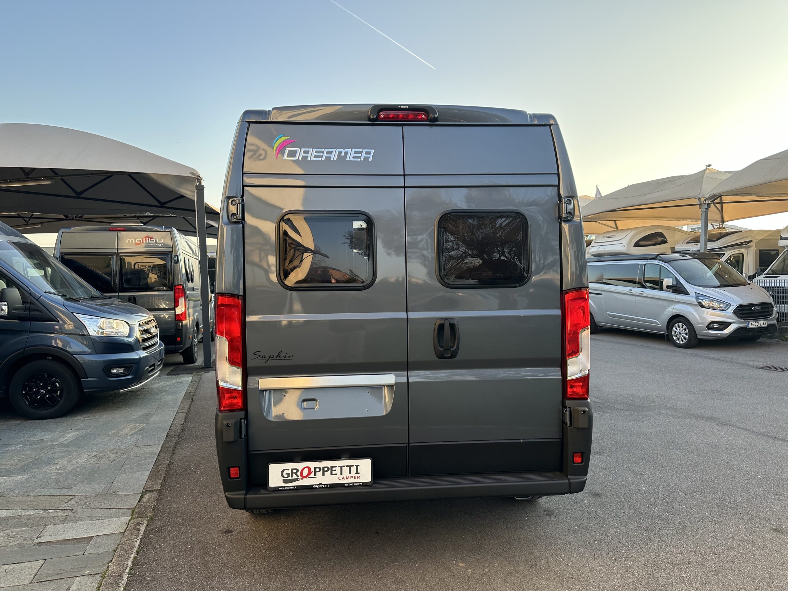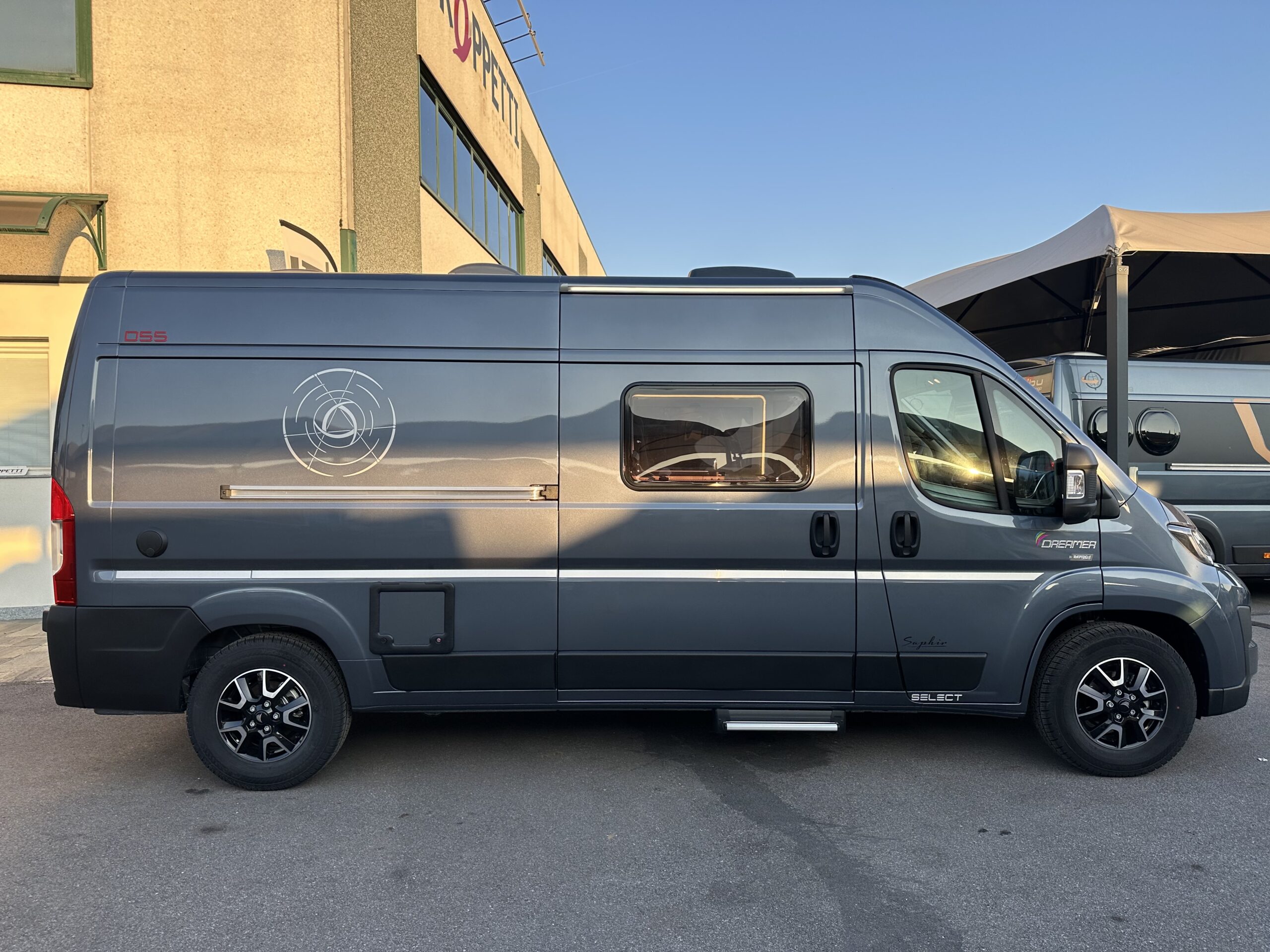 ALLESTIMESTO SPECIALE SAPHIR: Mobilio in finitura speciale Serenity, Tappezzeria speciale TEP in colore Dakota, Accessori esterni cromati con scritte SAPHIR in nero su porte cabina e portellone posteriore, Verniciatura esterna in colore IRON GREY di serie, accessori interni e rubinetteria nero opaco,