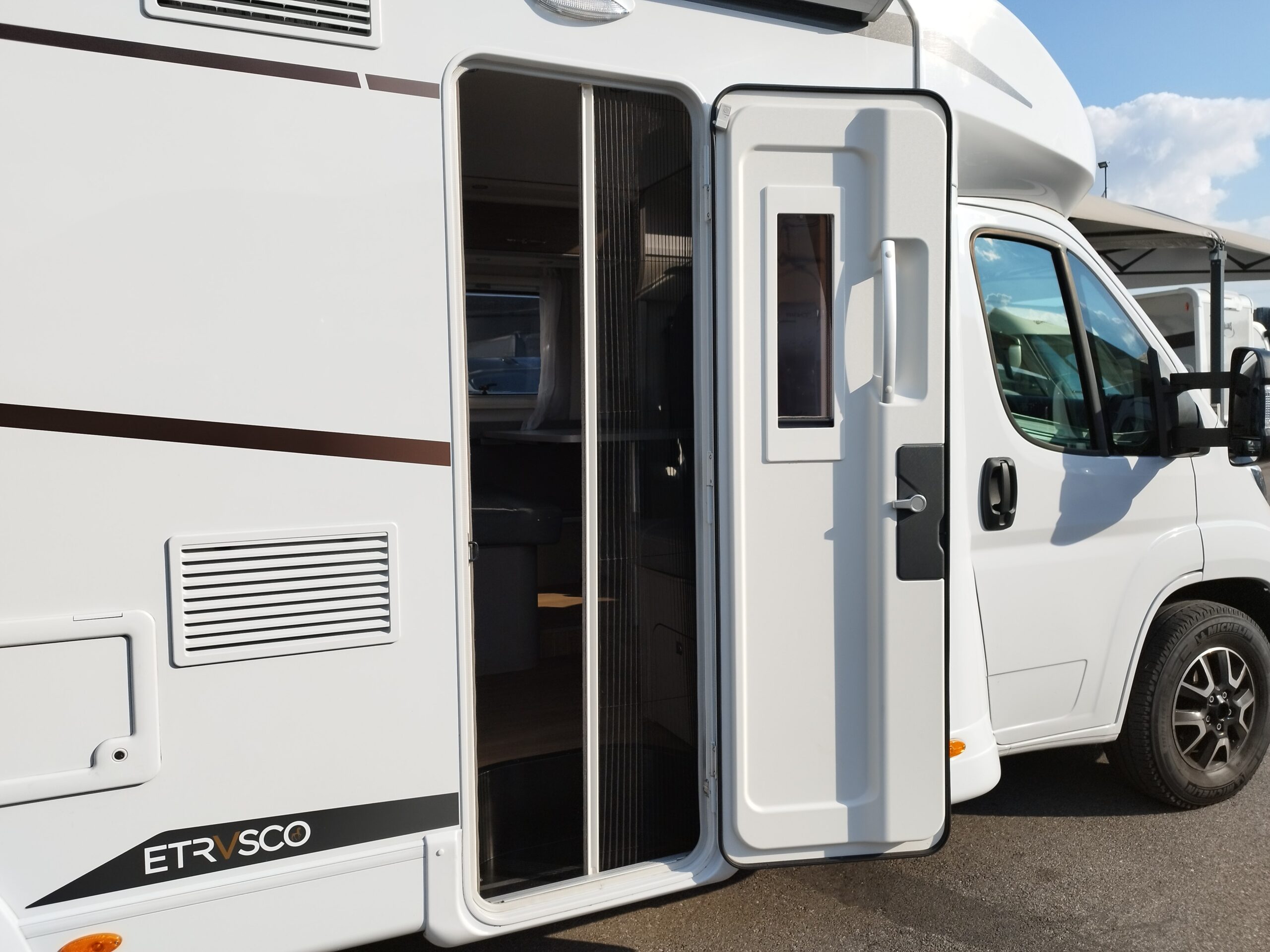 Prolunga tavolo dinette, Oblò Sky roof su cupolino anteriore, Oblò Midi Heki sopra cucina Zanzariera scorrevole porta cellula