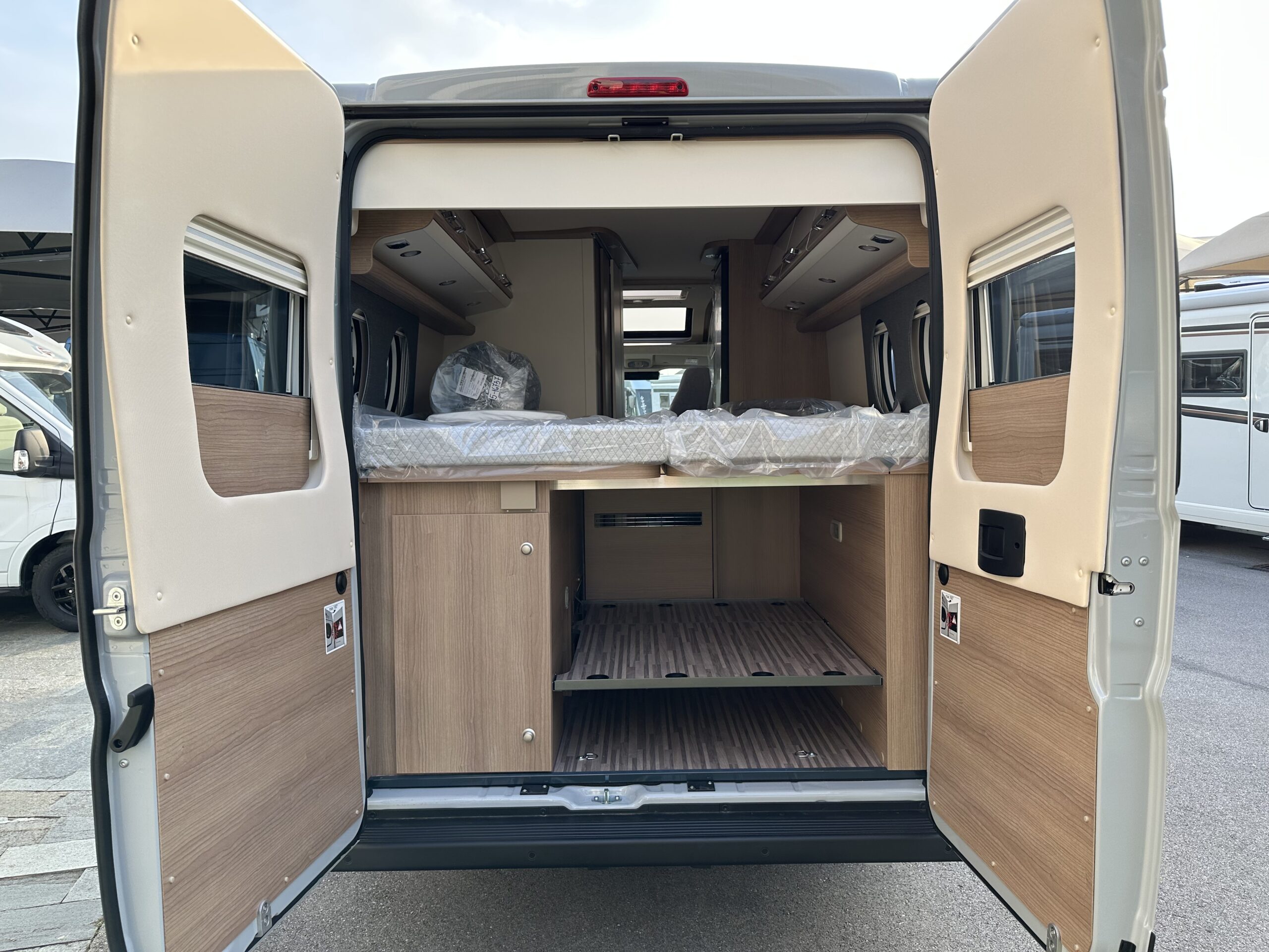 – PACCHETTO CELLULA : Pannello comandi digitale Truma CP Plus – Applique da soffitto zona giorno con illuminazione diffusa LED indiretta – Rivestimento tetto con strato di microfibra coibente – Serbatoio inserito in un contenitore e isolato – Rifinitura cucina – Sistema bloccaggio carichi nel portabagagli – Materassi di qualità in schiuma fredda nel letto posteriore