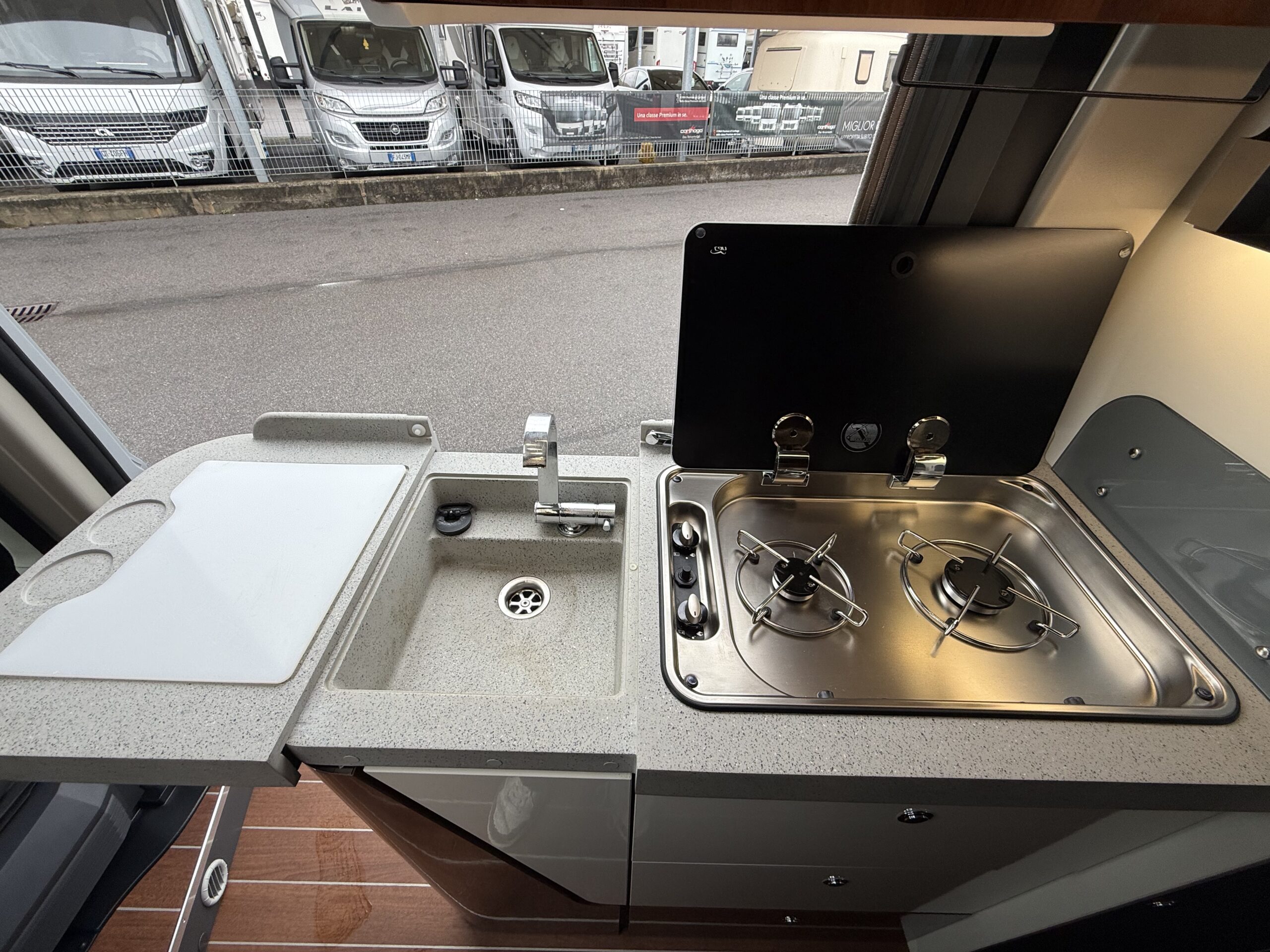 Veranda esterna in colorazione nera – Pannello solare – Skyroof panoramico su cupolino – Zanzariera scorrevole portellone laterale – Porta bici posteriore apribile – Antifurto perimetrale e volumetrico – Barra attacco tavolo esterno – Casse audio posteriori – Tappezzeria in similpelle – Presa 220 v aggiuntiva nel posteriore – Letto posteriore regolabile in altezza con saliscendi elettrico (h garage 130cm) – Luce esterna a led – Oblò Midi Heki zona giorno – Rivestimento garage rinforzato in alluminio mandorlato – Doccia esterna in garage posteriore – Frigorifero a compressore – Riscaldamento Truma Combi D a gasolio – Piastra porta Tv + Tv zona giorno