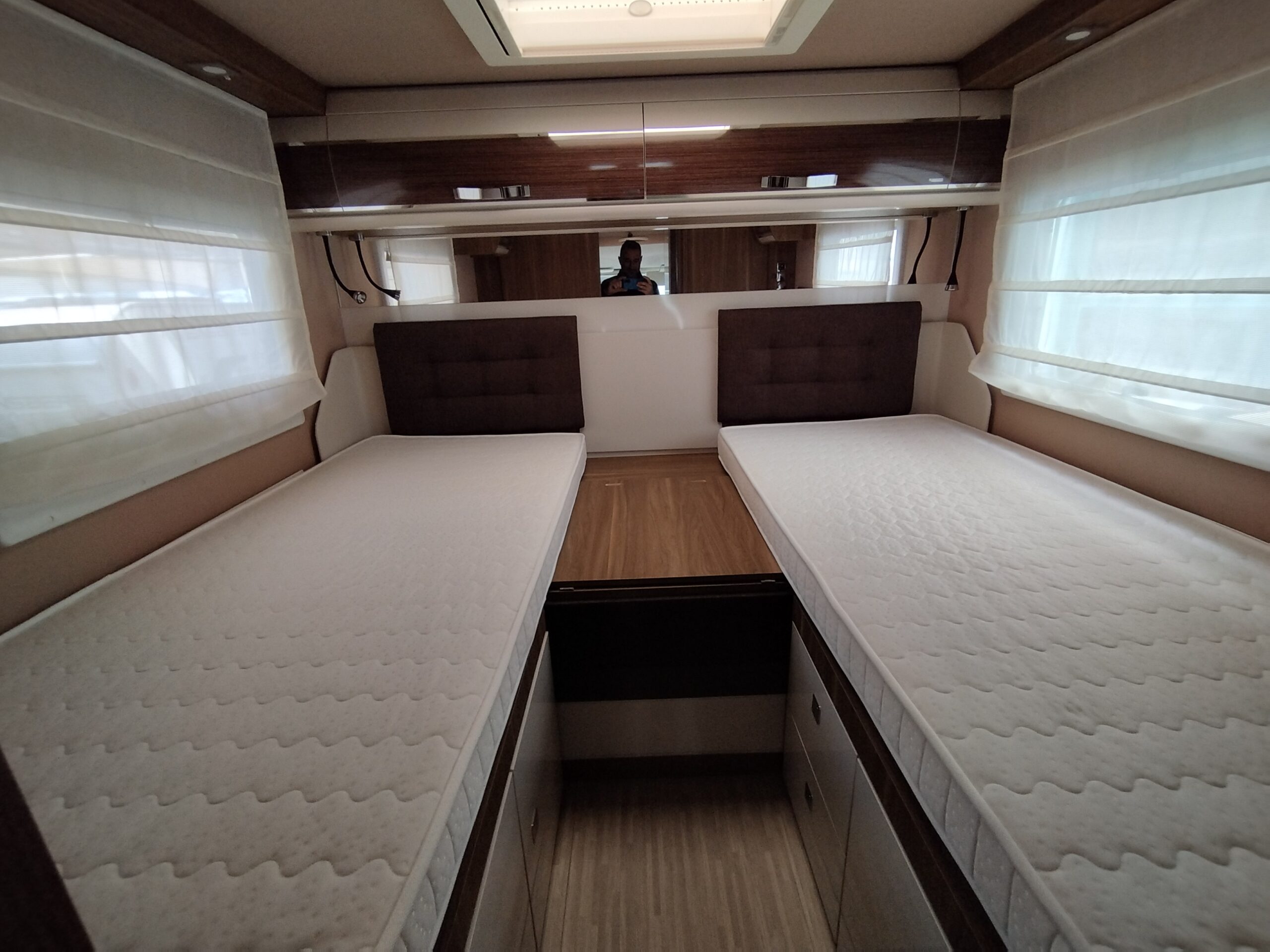 Veranda esterna nera a tetto – Piedini oleodinamici autoilivellanti i-Jack – Clima cellula – Pannello solare – TV 27” SMART zona giorno – Doppio pavimento passante – Attacco esterno acqua calda/fredda all’interno del garage – Cablaggi + piastra + TV da 24” zona letti posteriori – Attacco esterno gas – Oblò Midi Heki zona giorno – Luci a Led interne – Porta cellula XL a 2 punti, con finestra, pattumiera e chiusura centralizzata – Luce esterna – Sistema di sicurezza in viaggio per il gas Truma Secumotion con scambiatore automatico bombole Duocontrol – Oblò Sky Doom su cupolino – Frigorifero grande a commutazione automatica – Pareti interne e tetto con rivestimento in soft touch – Zanzariera scorrevole porta cellula – Presa USB aggiuntiva su letto posteriore – Comando CP Plus per Truma Combi – Tappezzeria interna in ecopelle – Oblò Midi Heki su letto posteriore – Presa 220V aggiuntiva in garage – Zanzariera scorrevole porta cellula – Oblò con Turbovent in cucina – Sportello grande garage lato guidatore – Casse audio in cellula – Prolunga + cuscino per grande matrimoniale posteriore – Presa USB doppia aggiuntiva zona dinette