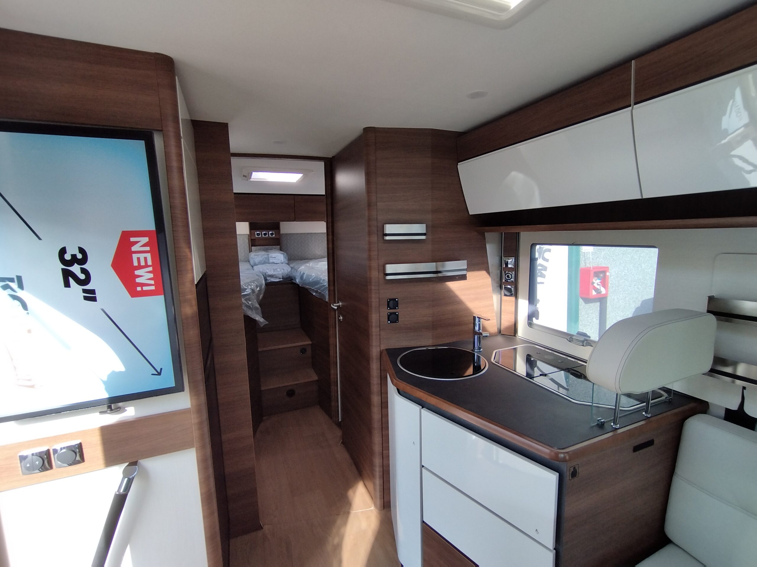 Air bag conducente e passeggero – climatizzatore cabina manuale – Porta conducente con alzacristallo elettrico – Chiusura centralizzata cellula e conducente – Frontale a profilo ribassato per una migliore visibilità – Fari anteriori con luci a led diurne – Fari posteriori a led – Gradino elettrico accesso cellula – Barra di illuminazione a led soffitto gavone – 100% poliestere tetto, pareti e sottoscocca – isolamento in Styrofoam – Riscaldamrento combinato TRUMA COMBI 6 a gas ed elettrico con comando del riscaldamento con InetX – Sistema anticollisione gas – illuminazione dell’ambiente 100% a led – Nuovo rivestimento in laminato su piano di lavoro cucina e tavolo salotto – cucina con cassetti con chiusura a richiamo e bloccaggio centralizzato – Predisposizione per doppia batteria servizi – Caricabatterie predisposti per batterie al litio – mobile TV con staffa per flatscreen LCD 32″ – Letto centrale XXL con misure da 160 cm x 196 cm – Rete letto retrattile – Letto centrale regolabile elettricamente in altezza – Letto basculante a 2 posti con doghe – Serbatoio acqua potabile da 140 lt (20 lt per la condizione di marcia) – Serbatoio acque di recupero da 90 lt – Frigorifero da 156 lt con AES (selettore della miglior fonte di energia) – Vano porta bombole per 2 bombole da 11kg