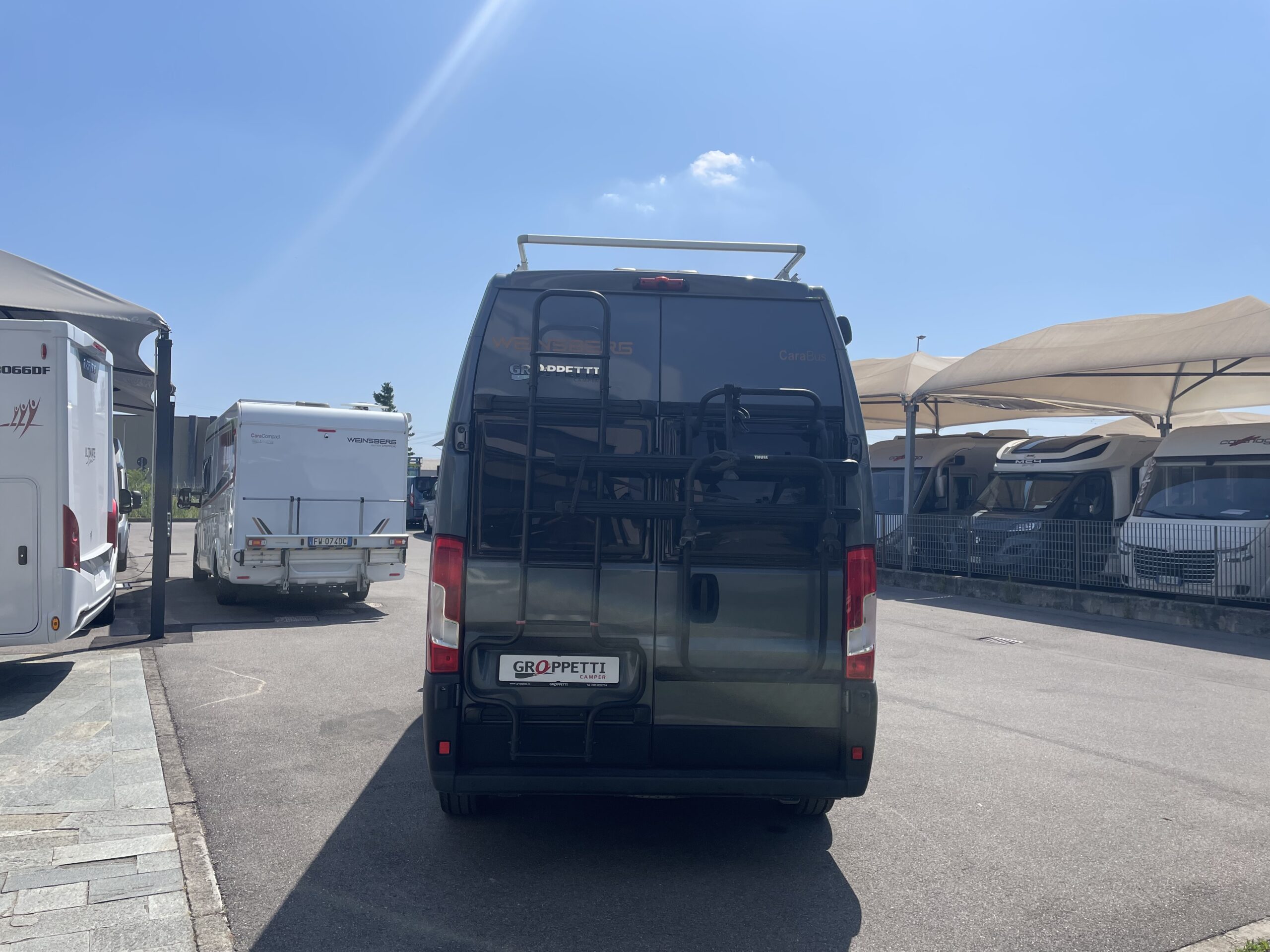 Veranda esterna Thule nera, Porta bici Thule 2 posti, Scaletta posteriore con bagagliera, Pannello solare
