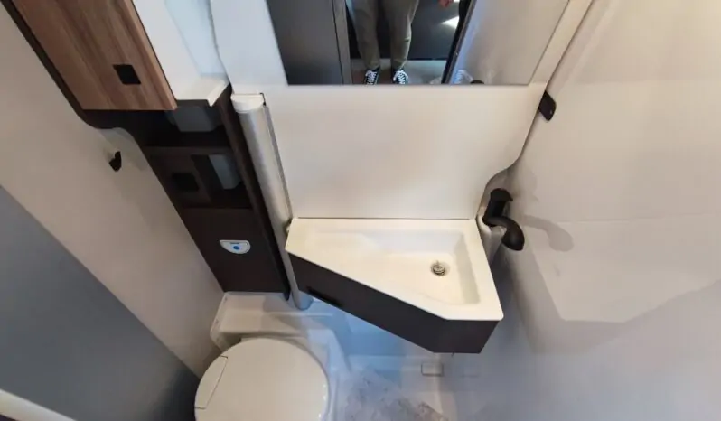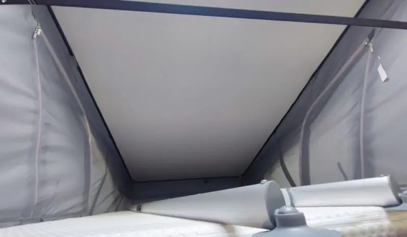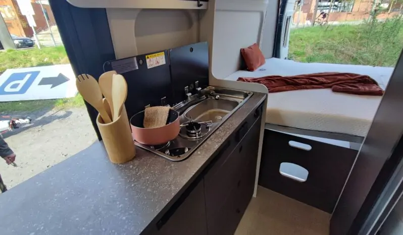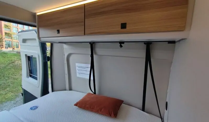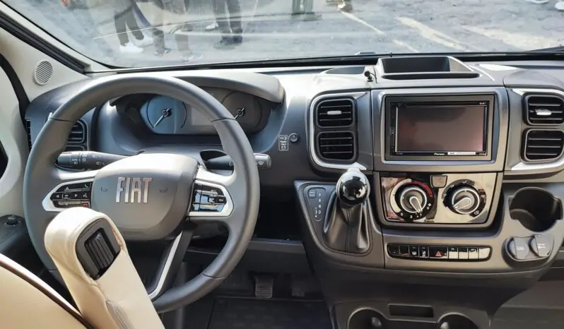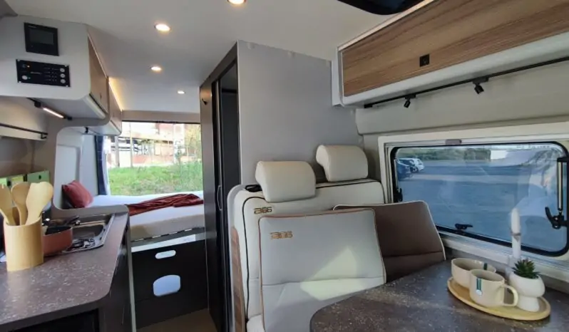 Mobilio interno in finitura casa pino, completo di blocco cucina e fornello a 2 fuochi, serbatoio acqua potabile con pompa a immersione, sedili anteriori con piastre girevoli, centralina di controllo CPU con caricabatterie e fusibiliera integrata, illuminazione interna ambiente a led, soffietto in tinta nera con nuovo sistema di apertura frontale completa, predisposizione per impianto litio, predisposizione per gancio traino, vetri posteriori oscurati, prese 12V e usb, tavolo ripiegabile, Gradino d’ingresso apribile elettricamente