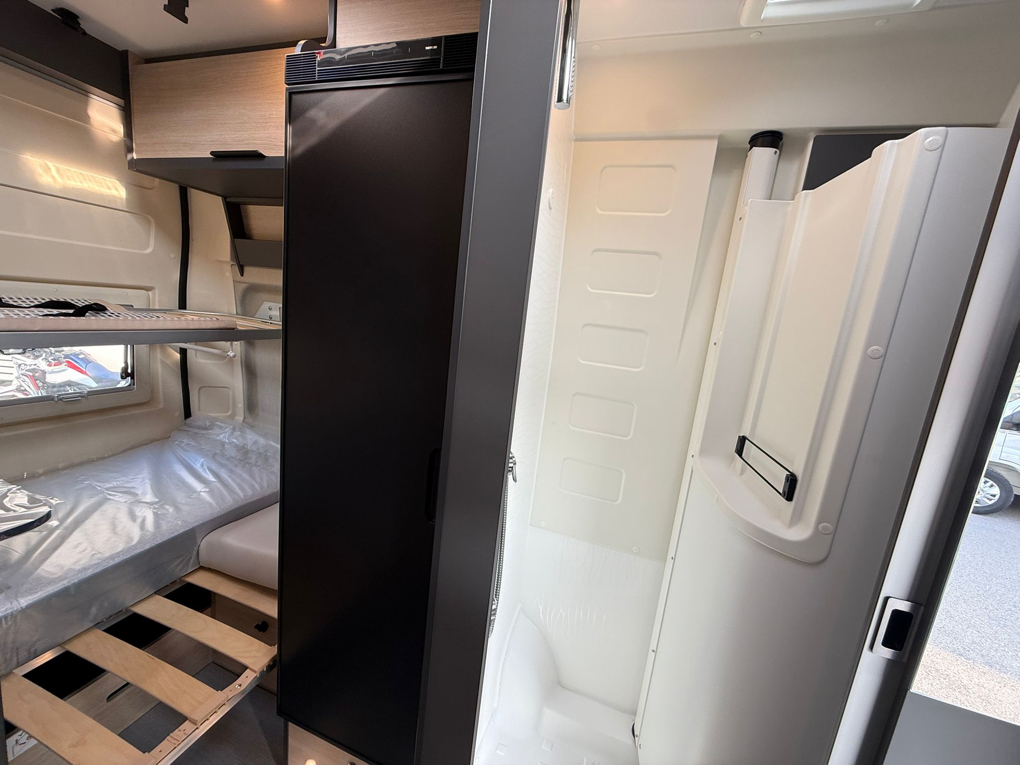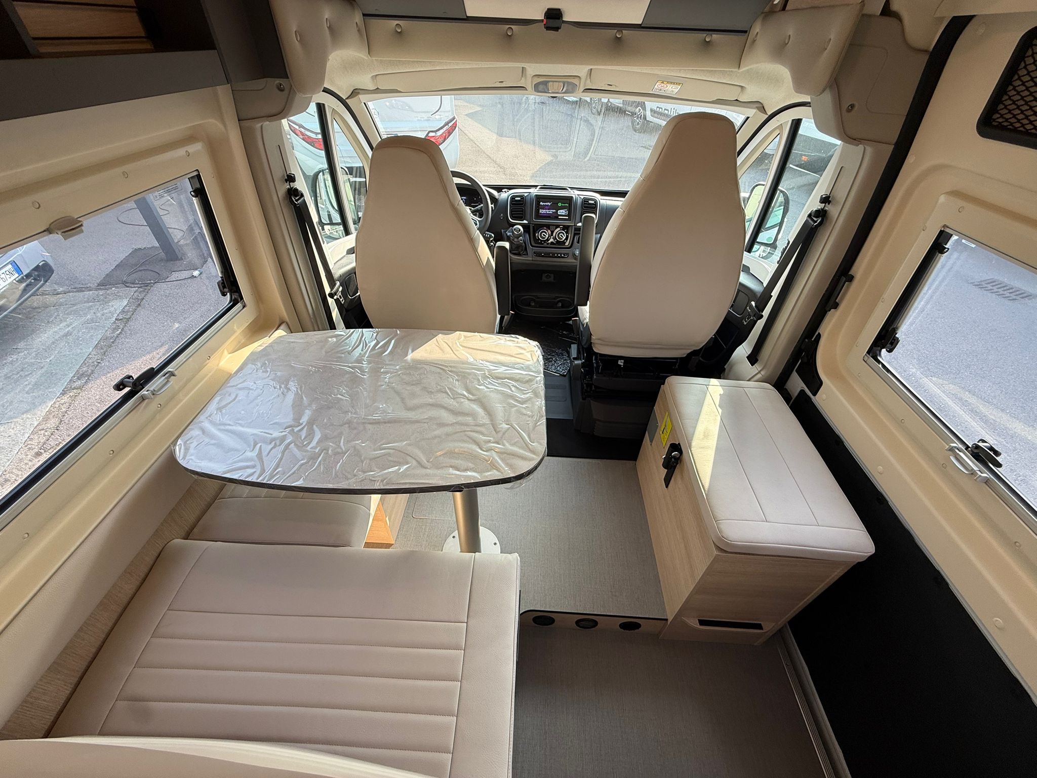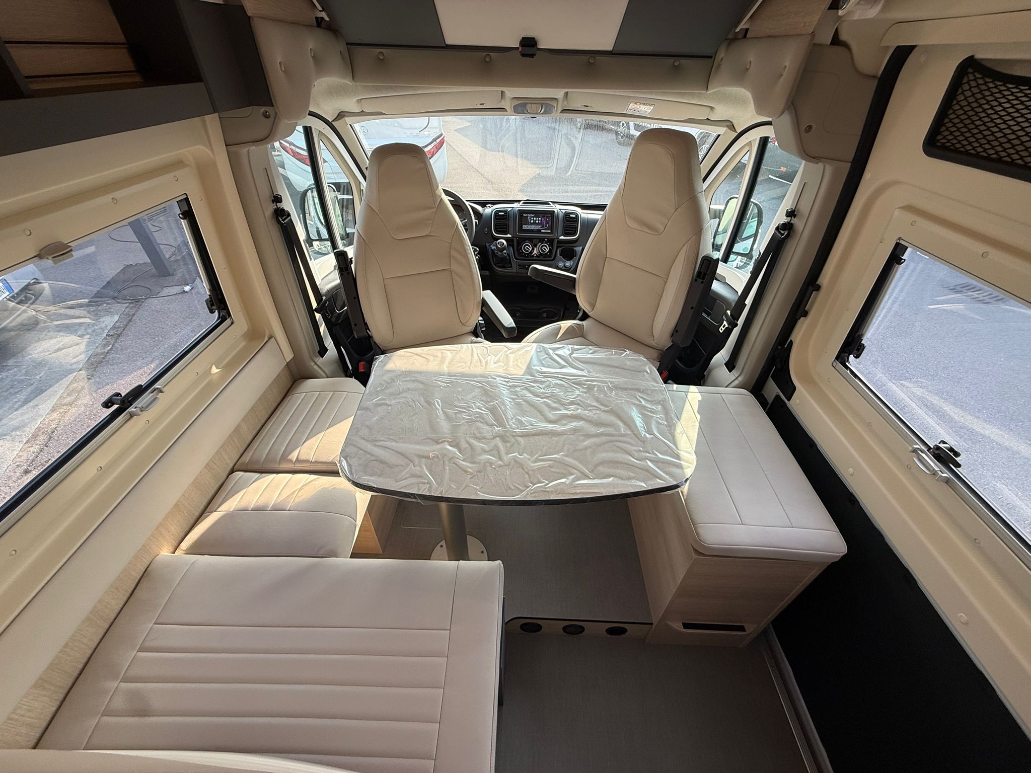 nero, Comandi radio al volante, Fari fendinebbia anteriori, Taglio cabina, Stazione multimediale DAB PIONEER® con schermo 6,8″ e funzioni APPLE CAR PLAY/ANDROID AUTO, Telecamera posteriore, Arredamento tessuto/Tep, 2^ batteria AGM da 92 Ah, 2^ chiave con telecomando, grondaia porta laterale con illuminazione a Led integrata, illuminazione d’ambiente mobiletti pensili e camera, decorazione esterna FUN+ letto supplementare in dinette