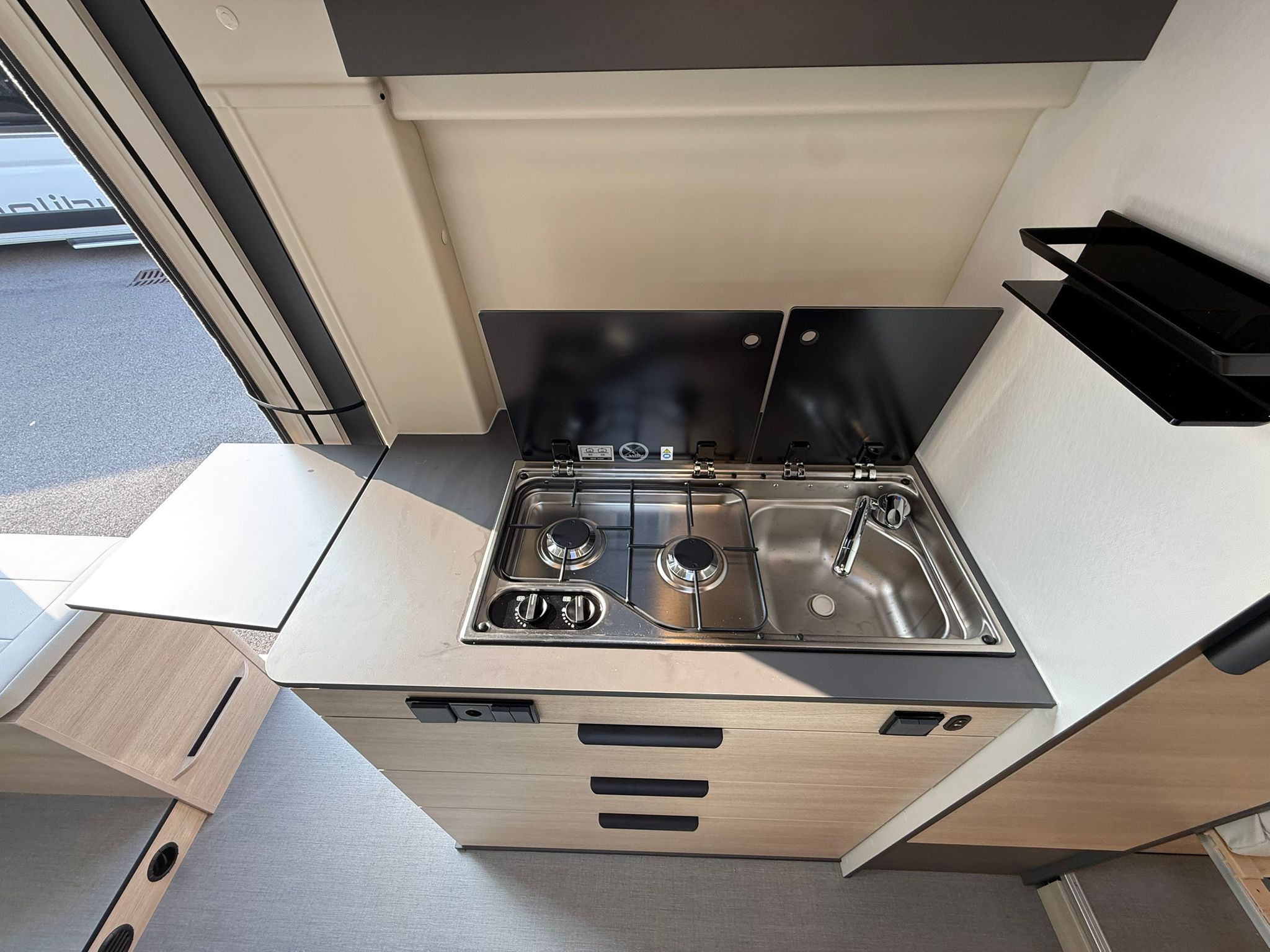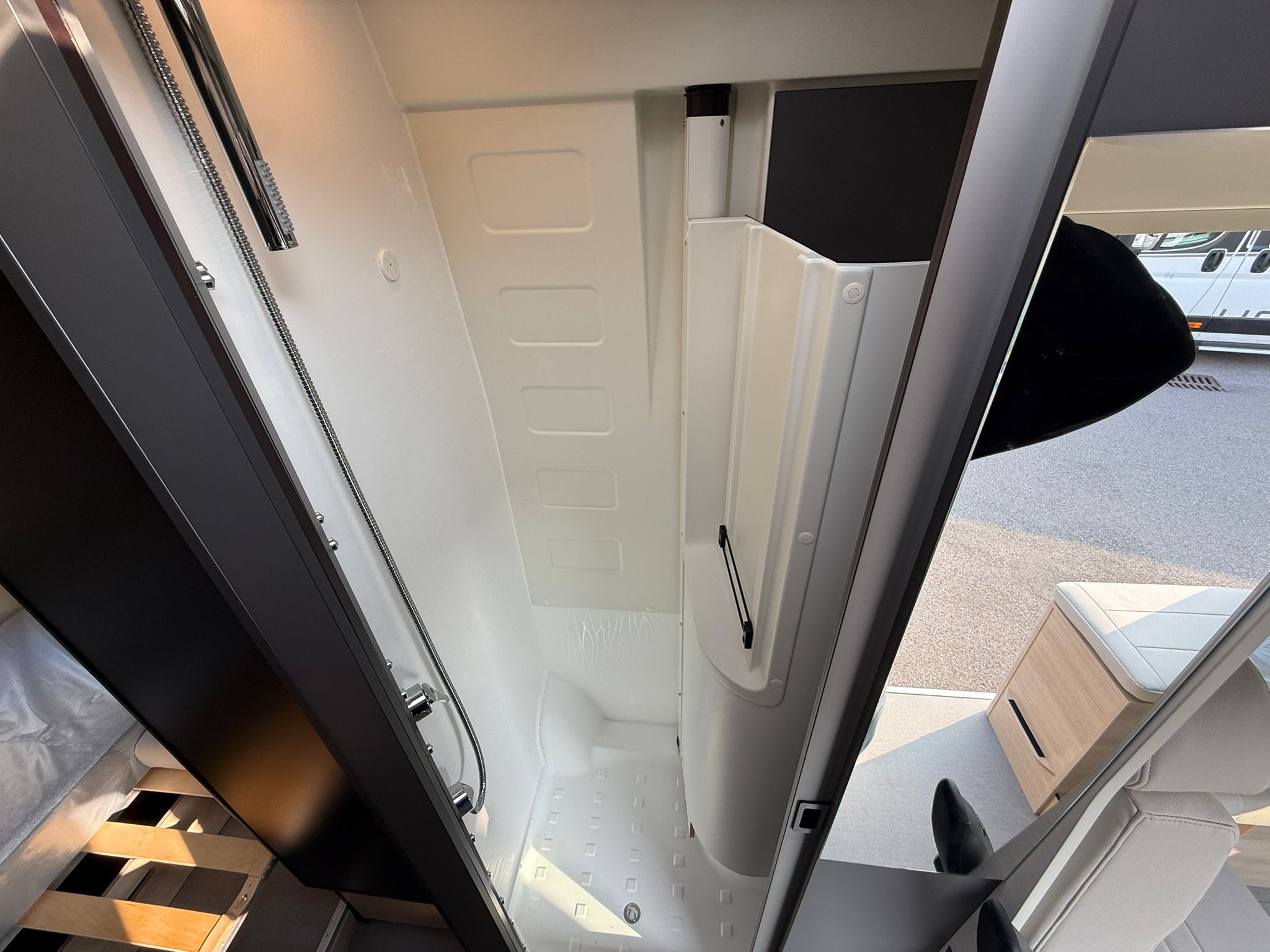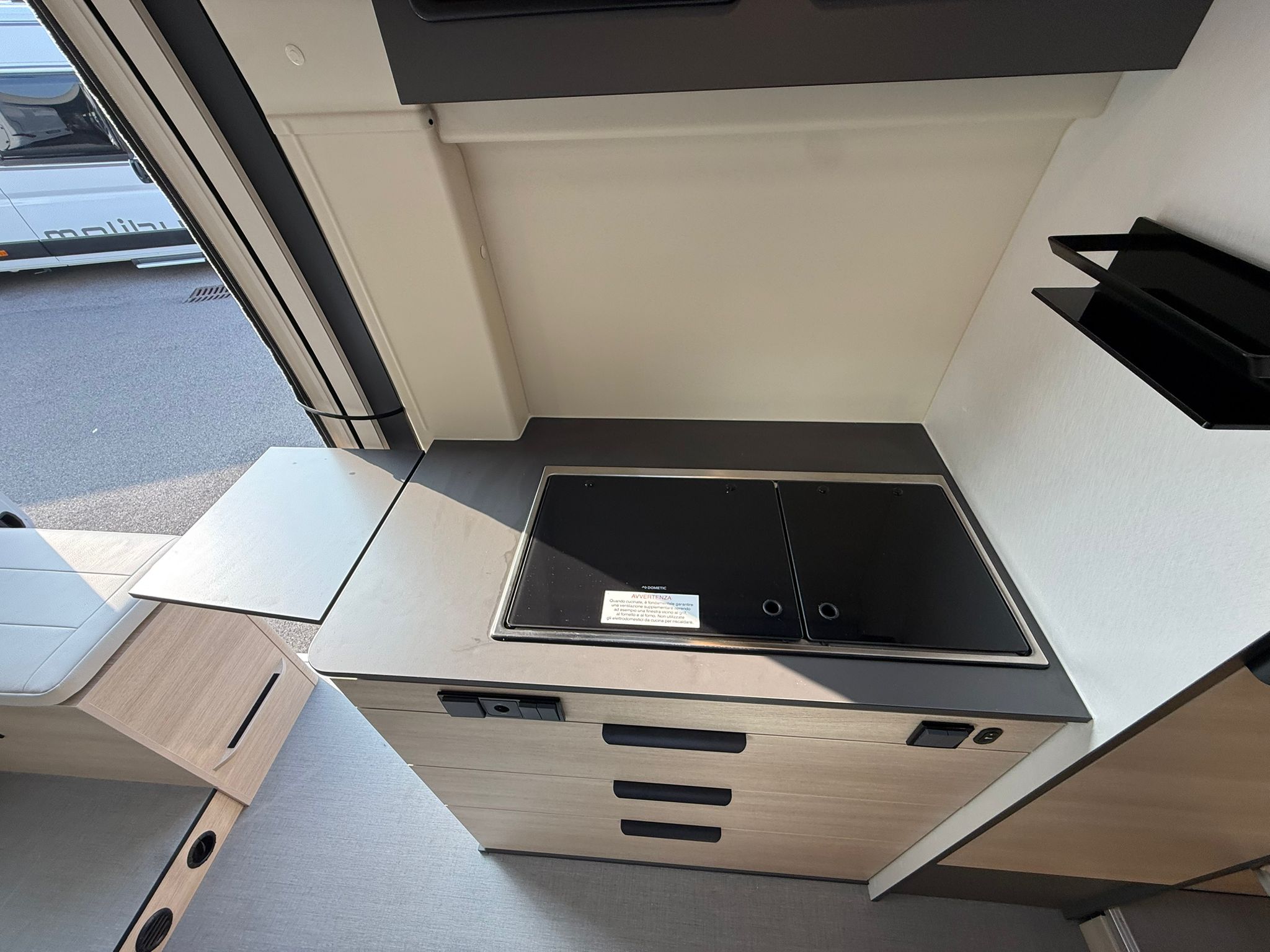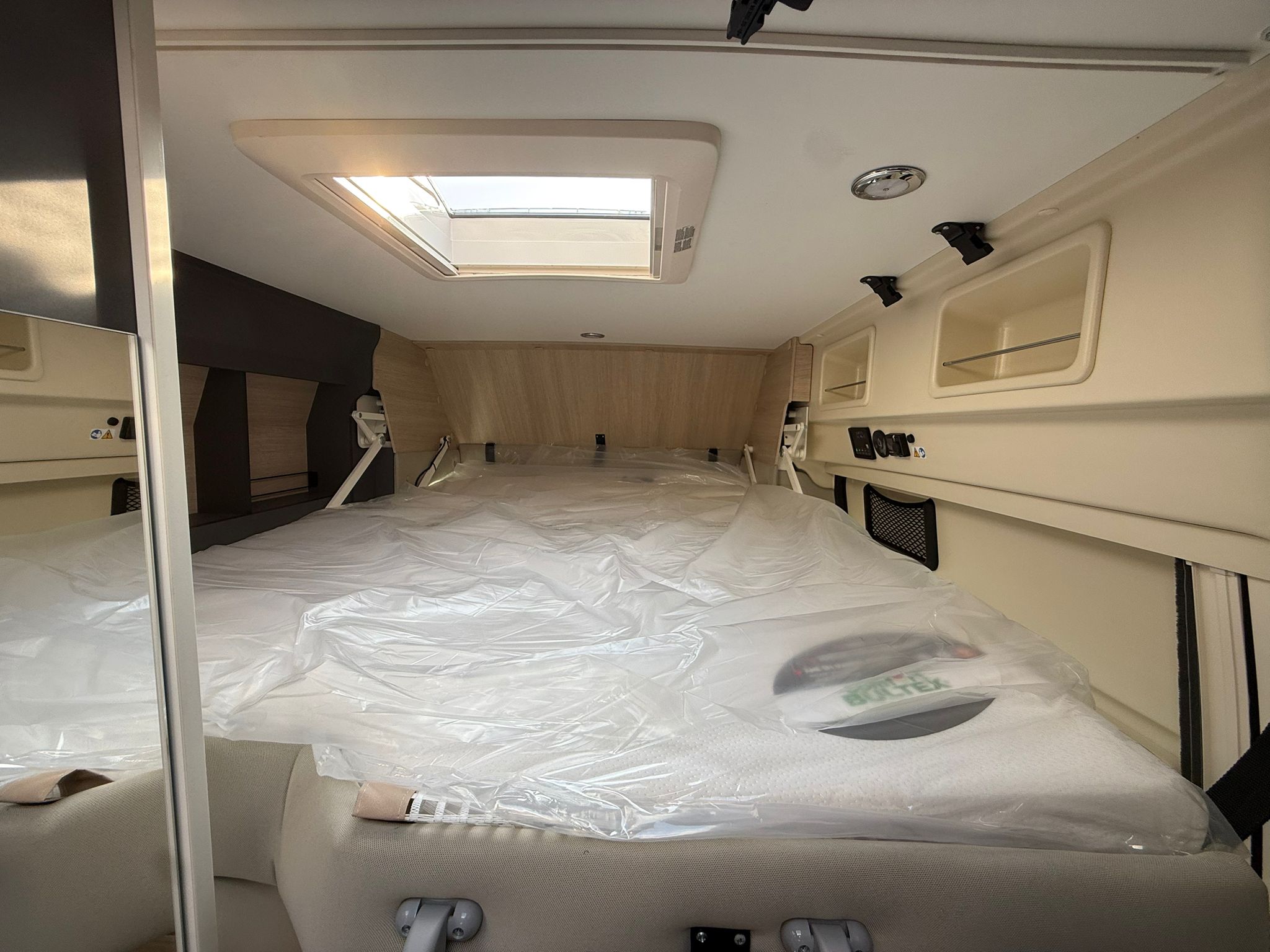 nero, Comandi radio al volante, Fari fendinebbia anteriori, Taglio cabina, Stazione multimediale DAB PIONEER® con schermo 6,8″ e funzioni APPLE CAR PLAY/ANDROID AUTO, Telecamera posteriore, Arredamento tessuto/Tep, 2^ batteria AGM da 92 Ah, 2^ chiave con telecomando, grondaia porta laterale con illuminazione a Led integrata, illuminazione d’ambiente mobiletti pensili e camera, decorazione esterna FUN+ letto supplementare in dinette