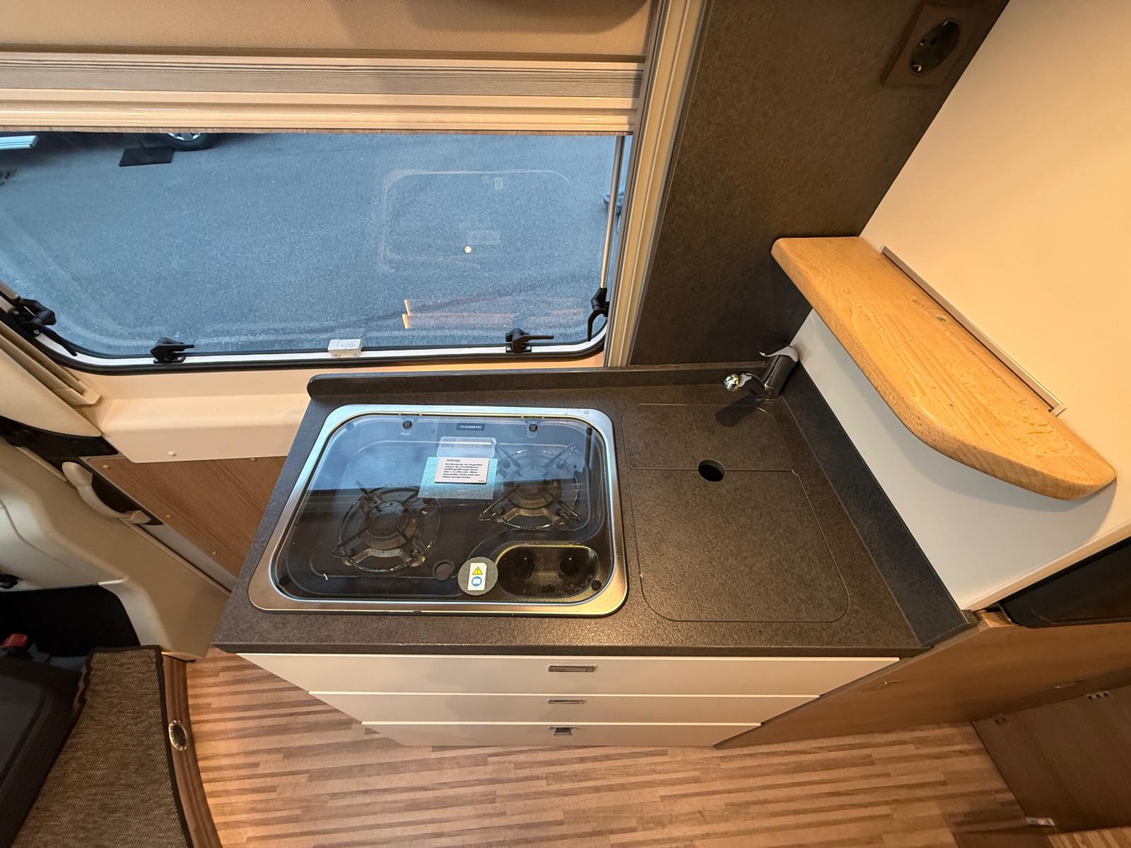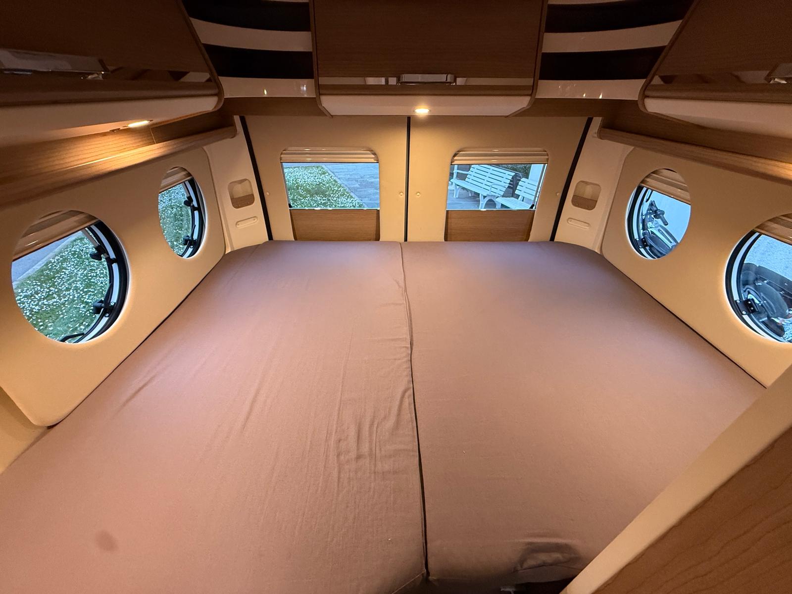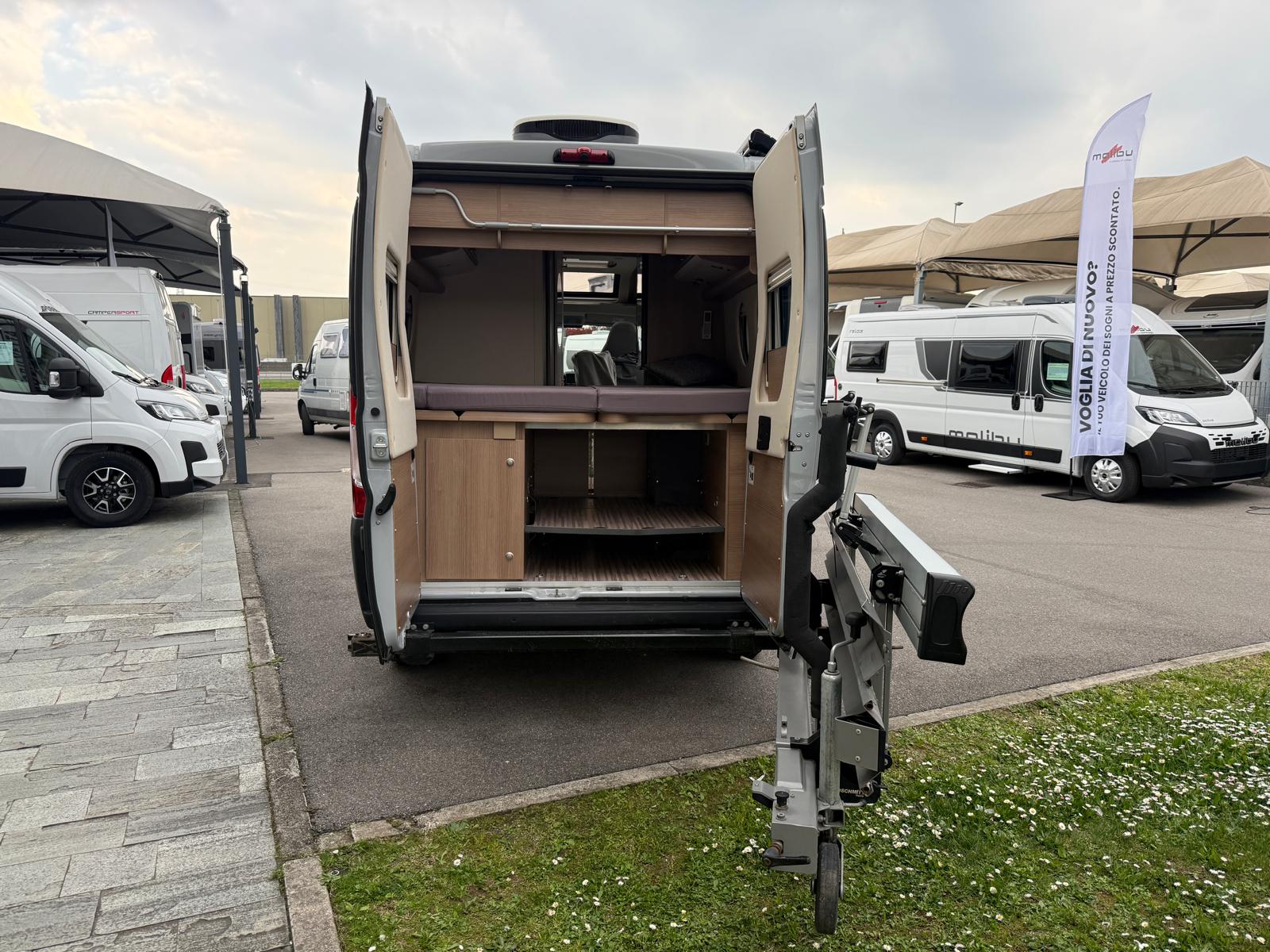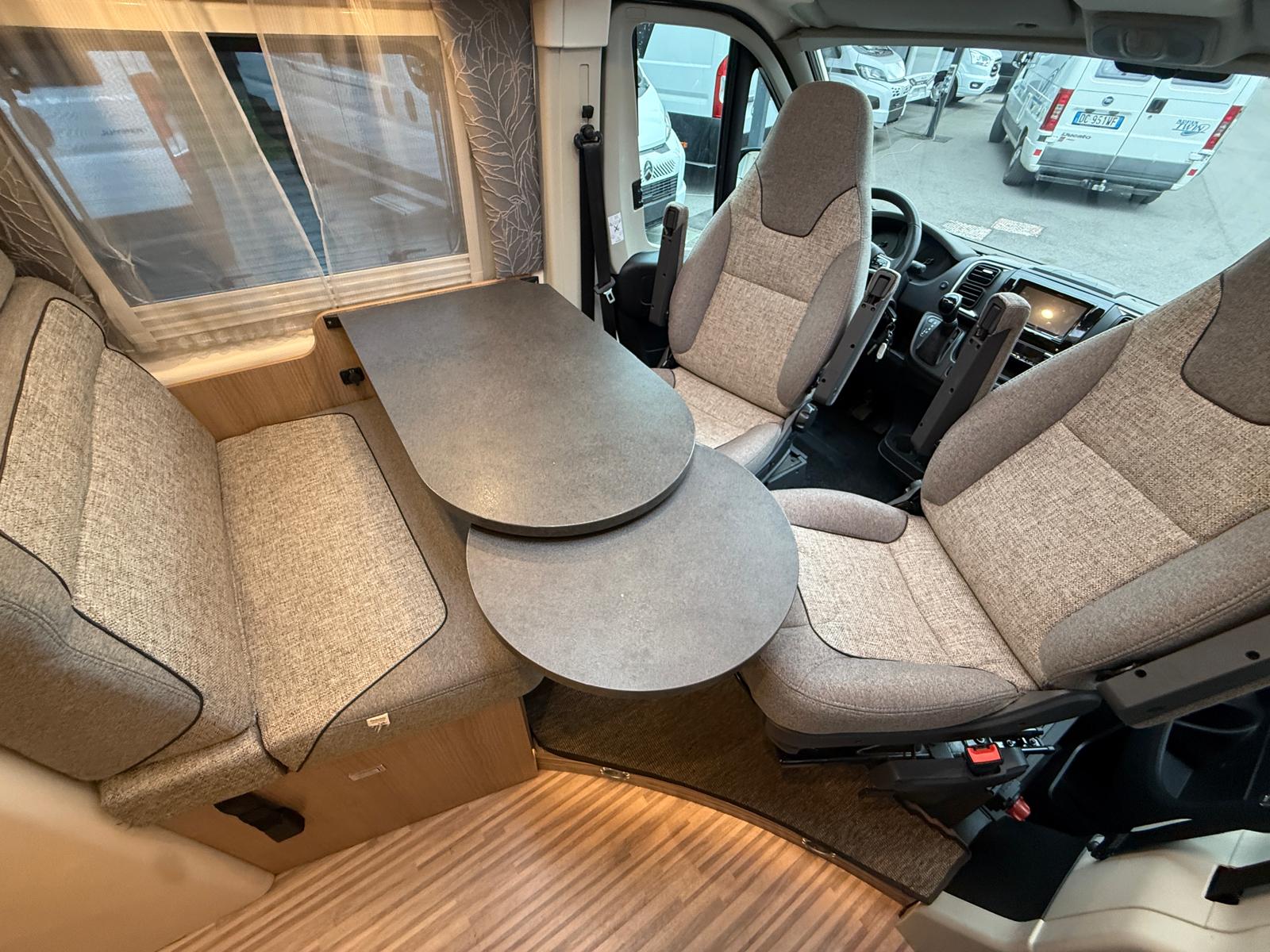 Veranda esterna con cassone nero – Porta moto Dolfin apribile Goldschmitt da 150 kg – Impianto con batteria al litio da 200 Ah Zenith – Clima cellula Telair – Antifurto perimetrale e volumetrico – Antenna satellitare a puntamento automatico – Pannello solare – Truma Combi D 6 E (funzionalità a gasolio ed elettrica) – Comando digitale Truma CP Plus – Oblò Midi Heki zona giorno – Impianto con antenna Tv digitale terrestre – Inverter con remote – Doppie foderine cuscineria interna – Rivestimento interno climatico in microfibra su soffitto e pareti – Piastra porta Tv + Tv zona giorno – Luce esterna su portellone laterale – Kit di trasformazione per 3° letto in dinette – Materassi posteriori a 7 zone – Doppio pavimento di stivaggio posteriore – Zanzariera scorrevole portellone laterale – Prolunga piano cucina – Copri lavello diviso con tagliere e supporto a parete – Serbatoio acque di scarico incassato e completamente isolato – 2 oblò circolari lato dx e lato sx – Frontali cucina color bianco madreperla –